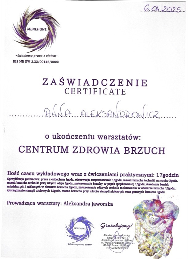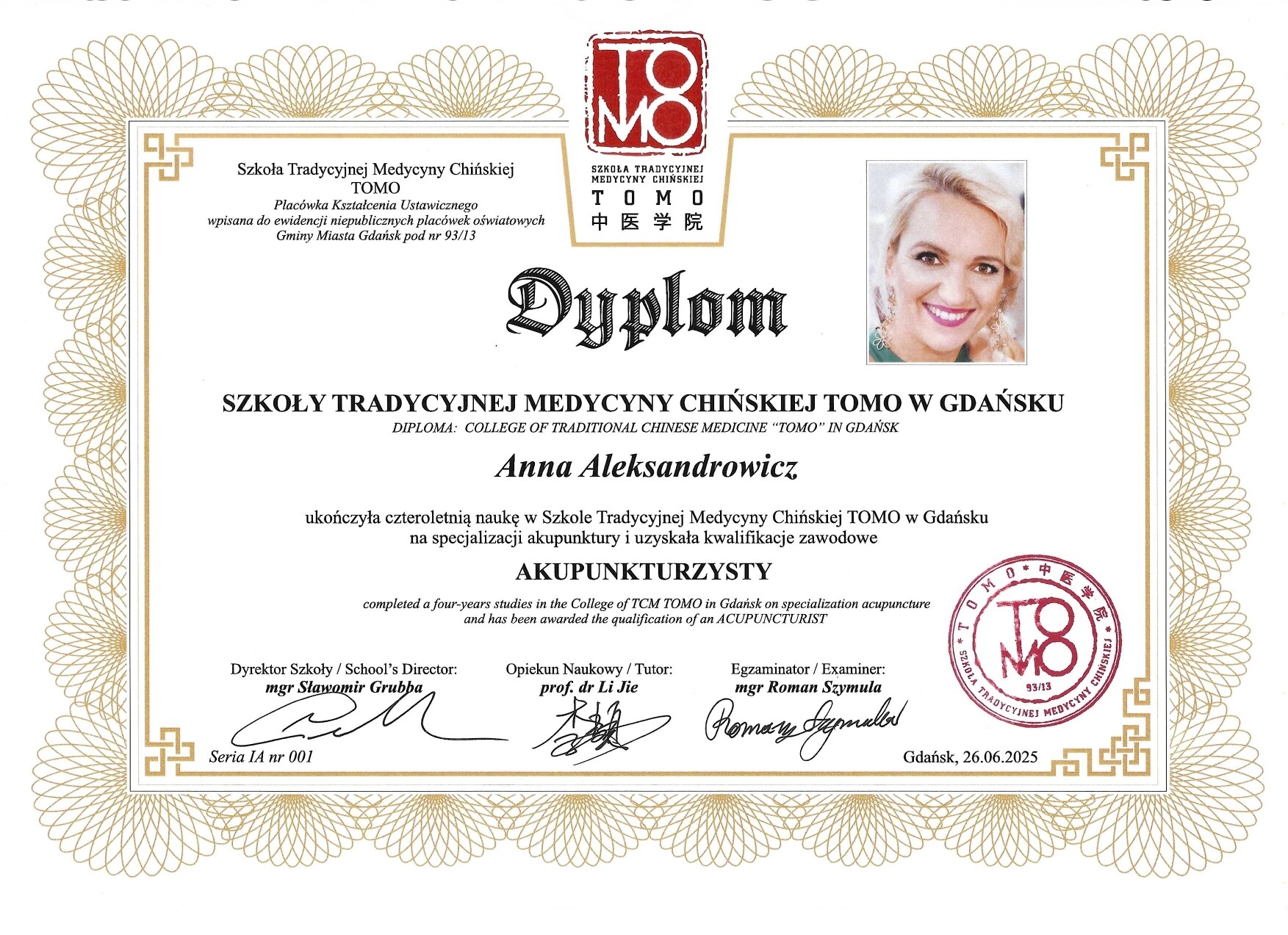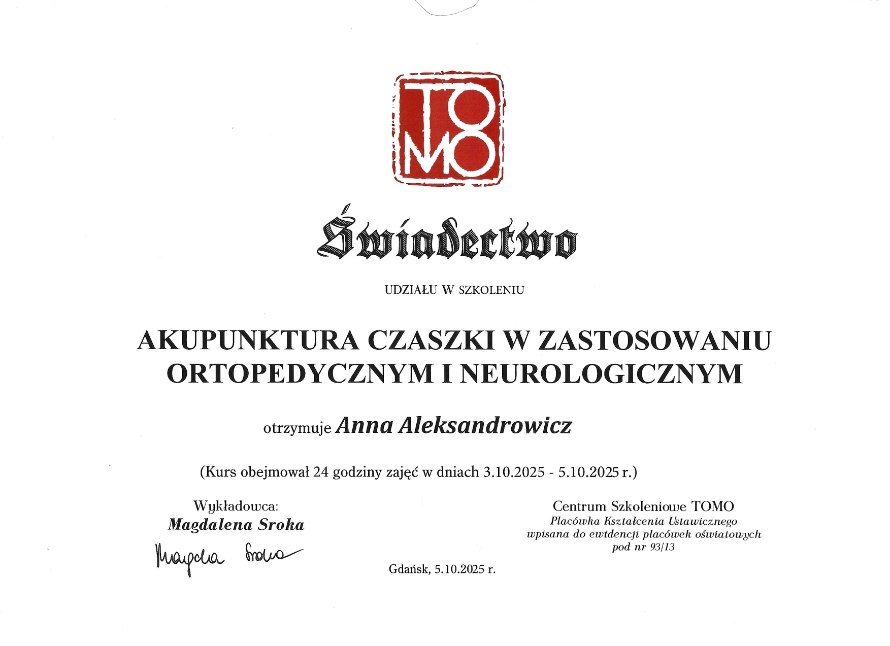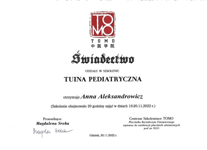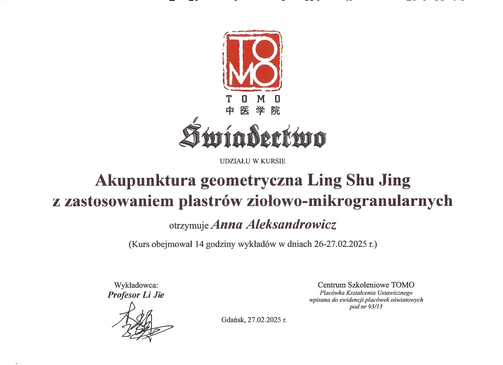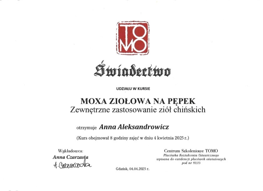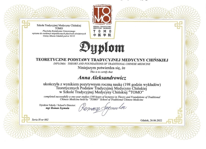 To było jak uderzenie piorunem! Do gabinetu terapeutki Medycyny Chińskiej trafiłam z polecenia z moim synem i już po 5 minutach wiedziałam, że to jest to, co chcę robić 😊 I wierzcie lub nie, ale już następnego dnia po tej wizycie zapisałam się do szkoły TOMO w Gdańsku na naukę, która trwała prawie 4 lata. W międzyczasie ukończyłam kilka krótszych kursów, o których przeczytasz poniżej.