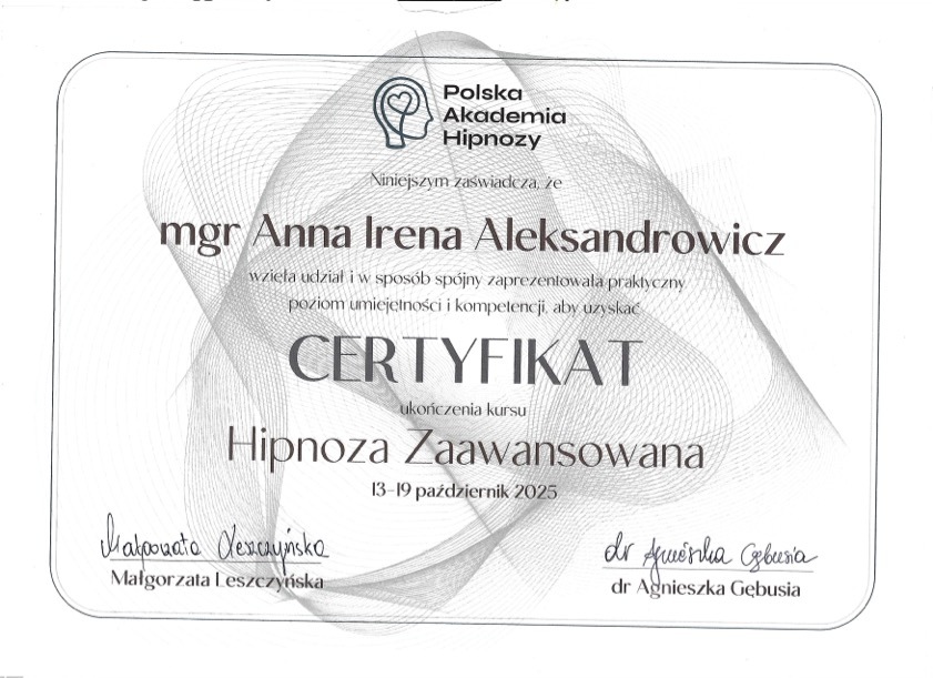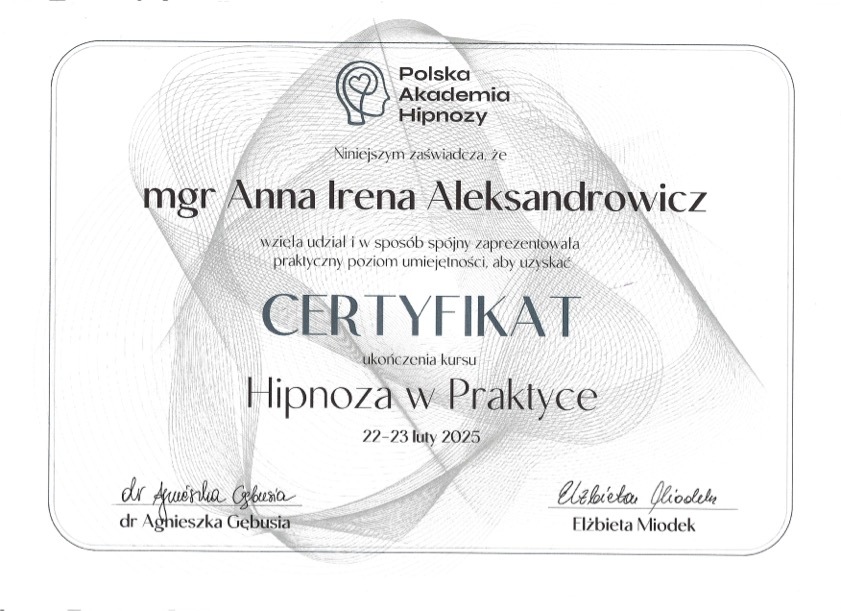 sama doświadczyłam sesji hipnotycznej, żeby uporać się z tym, co w tamtym czasie było dla mnie uciążliwe. I już ta jedna sesja mi pomogła! To było niesamowite i postanowiłam wtedy nauczyć się tej profesji, żeby jeszcze bardziej móc pomagać ludziom.