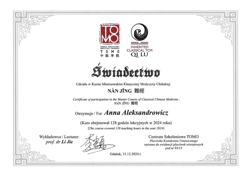 Na drugim roku równolegle uczęszczałam na zajęcia Master z profesorem Li Jie z zakresu Klasycznej Medycyny Chińskiej Nan Jing. Im więcej się uczyłam i praktykowałam na sobie i swojej rodzinie, tym lepiej się wszyscy czuliśmy. Wszelkie choroby czy przeziębienia zanim się porządnie zaczęły, to się kończyły. Było wyraźnie widać, że organizm uczy się radzić sobie z patogenami bez wsparcia środkami chemicznymi i to jest piękne i motywuje mnie do dalszego poszerzania wiedzy i umiejętności.